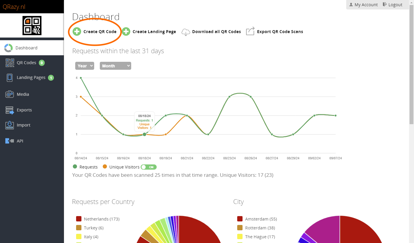 Log in bij uw account en klik op de groene +Create QR code.